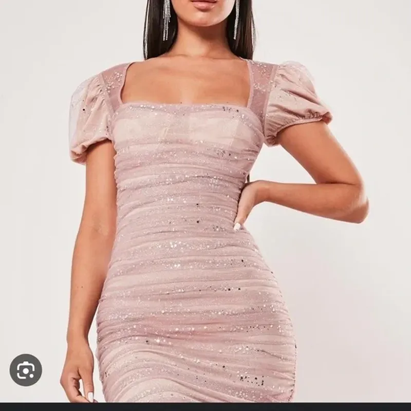 Праздничное сияющее платье MISSGUIDED нежного розового цвета с золотистыми блестками. Идеальный вариант для вечеринки и выпускного вечера. Впитываемую смотрится просто роскошно. Ткань тянется на 10 см. Размер XS-S. Длина платья 90 см.