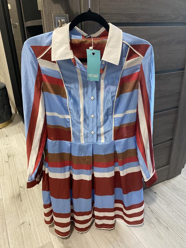 Сукня в різнокольорову смужку з білим коміром. Шифон сатін (100%поліестер). Розмір М. Український бренд MUST HAVE. Сукня нова, з біркою