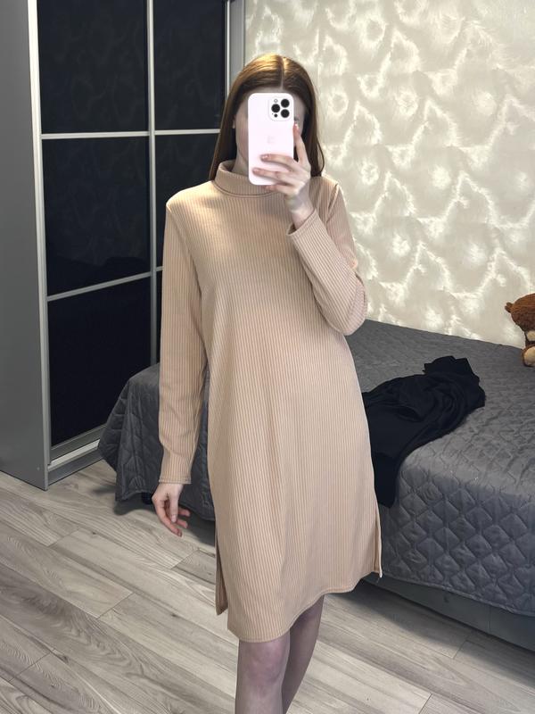 Платье в рубчик с разрезами по низу. Прямого кроя. Размер M-L. Може бути і на s. Подойдет под поясок или к беременным. Длина платья 90 см Длина рукава 58 см Плечи 40 см Полуобхват груди 43-47 см Полуобхват талии 44 см (прямой крой) Полуобхват бедер 45-48 см