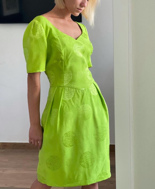 Яркое шелковое зеленое салатовое неоновое платье с азиатским принтом