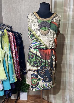Гарне збереження. Шкіряний пояс у комплекті. Розмір m, вдягнуто на манекен s/m. Має гладку чорну приємну підкладку. Тканина має люрексні вставки та невеличке кошлачення. Заміри: Полуобх плечей 34 см Полуобх грудей 50 см Полуоб талії 38 см. Резинка тягнеться. Полуобх бедер 52 см ПО низ 57 мсм Довжина 94 см.