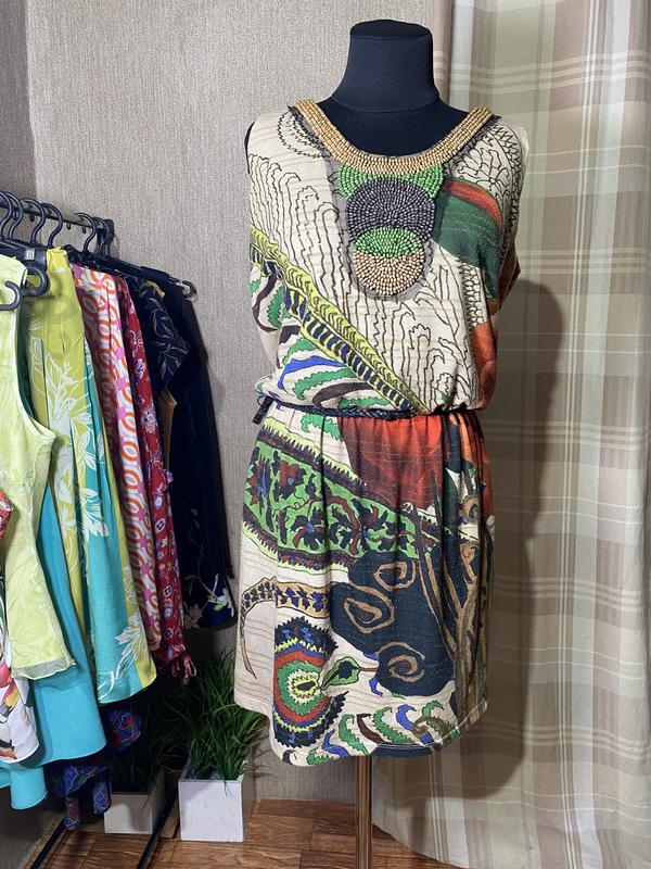 Хорошее сохранение. Кожаный пояс в комплекте. Размер m, одето на манекен s/m. Имеет гладкую черную приятную подкладку. Ткань имеет люрексные вставки и небольшое качание. Замеры: Полуобх плечей 34 см Полуобх груди 50 см Полуоб талии 38 см. Резинка тянется. Полуобх бедер 52 см ПО низ 57 мсм Длина 94 см.
