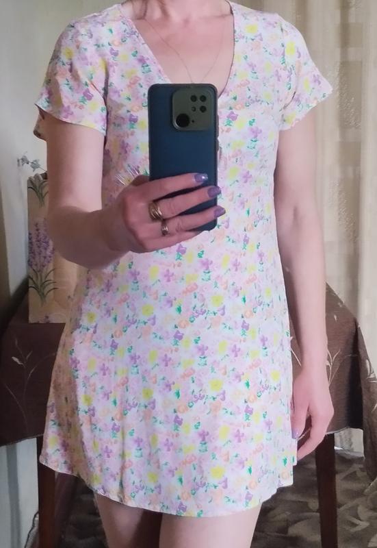 Літня сукня в ідеальному стані на розмір М/L, 46-48, матеріал 100%, віскоза. Дуже легенька і приємна до тіла. Заміри: Пог - 48 см, тягнеться до 52 см, Пот- 42 см, тягнеться до 46 см, Поб- 55 см, тягнеться до 62 см, довжина - 83 см .
