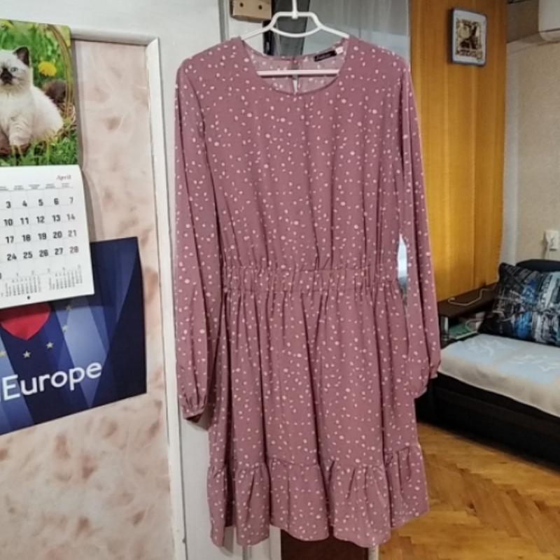 Сукня весняна з сатину. Розмір підійде на 48,50,52. Матеріал не мнеться, не "сідає". Талія на резинці. Заміри: довжина - 94, талія - 72, плечі - 44, груди - 110. Торг доречний.
