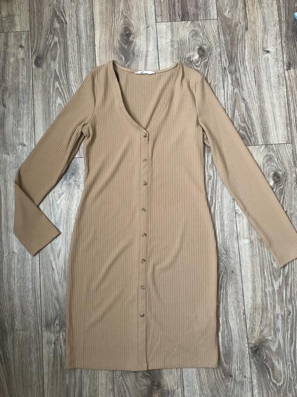 Гарного пісочного кольору(найточніше на останньому фото зі складом передався колір) Ґудзики нашиті, лише верхній розкривається Розмір йде на С, маленьку М Довжина 85 см Рукав 60 Груди 40 Талія 35 Стегна 42 Тягнеться гарно