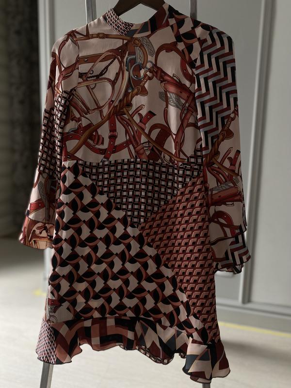 Шовкова красива сукня з яскравим малюнком. По низу і рукавам волнани. Пояс нижче грудей. Розмір S-M