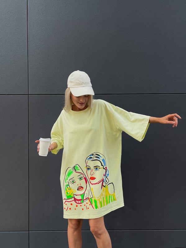 📸Фото Реал 💣 Новинка 🎭Футболка / сукня Ціна 720 грн ▫️Модель 389 ▫️Тканина: Турецький кулір (100% бавовна) ▫️Колір: кремовий, лайм, фісташка, голубий, графіт, малина Розмір: універсальний 42-46 🫶🏽Стильно та кайфово , свобідний крій oversize з якісним принтом, та з натуральної бавовни .