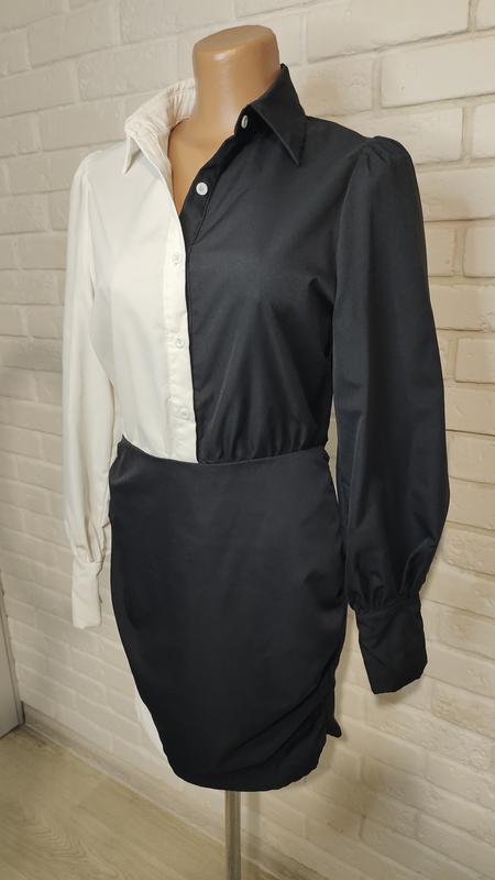 Сукня-сорочка чорно-білого монохромного відтінку з контрастним дизайном, довгі об'ємні рукави, спідниця зі збірками - фасон штучного запаху, і крій, що облягає, підкреслює фігуру, збоку застібається на потаємну блискавку, спереду верх імітація сорочки застібається на гудзики. Ця сукня-сорочка ідеально підійде на особливі випадки. Розмір європейський 10. Ідеальний стан. Заміри НПО грудей 45 см., НПО талії 39 см., НПО стегон 45 см., довжина рукава 63 см., довжина сукні 89 см.