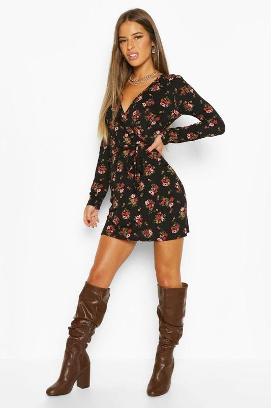 Платье на запах с длинным рукавом цветочным принтом Бренд: BOOHOO; Цвет: черный; Состав: вискоза 95%, эластан 5%; Размер: UK 8 /S; Ширина спинки: 35 см; Длина рукава: 53 см; ПОГ: 41 см; ПОТ: 32 см; Длина изделия: 74 см. Арт.: 21482.