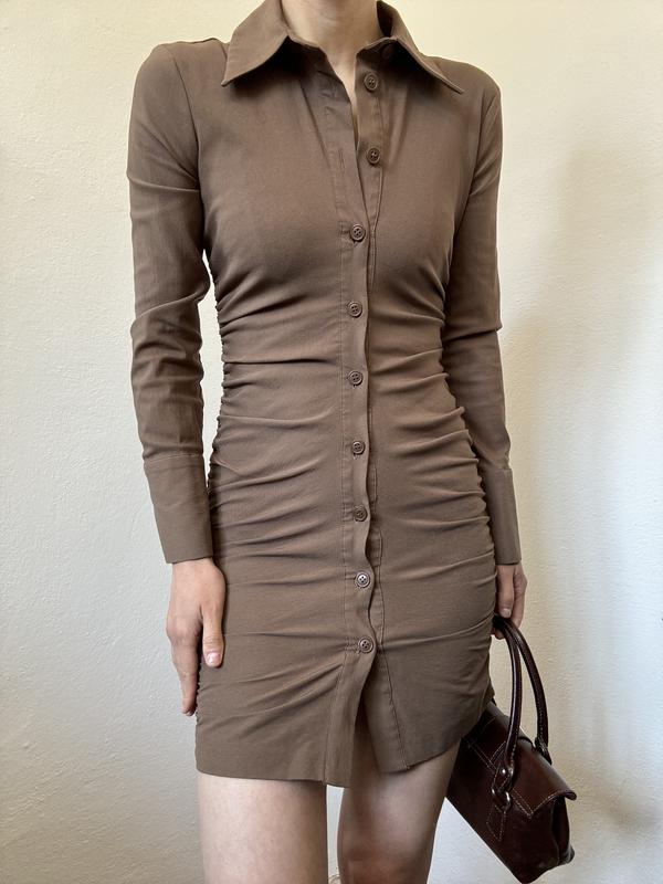 Красивое платье-рубашка в оттенке мягко от Zara Бирка со составом срезанная. На сайте указано: 75% viscose, 21% polyamide, 4% elastane. Стан - идеальный Размер Xs Замеры в спокойном состоянии: рукав-59 см, полуобхват груди-42 см (тянется до 46 см), полуобхват бедер-42 см (тянется до 48 см), длина-84 см. Одето на размер s