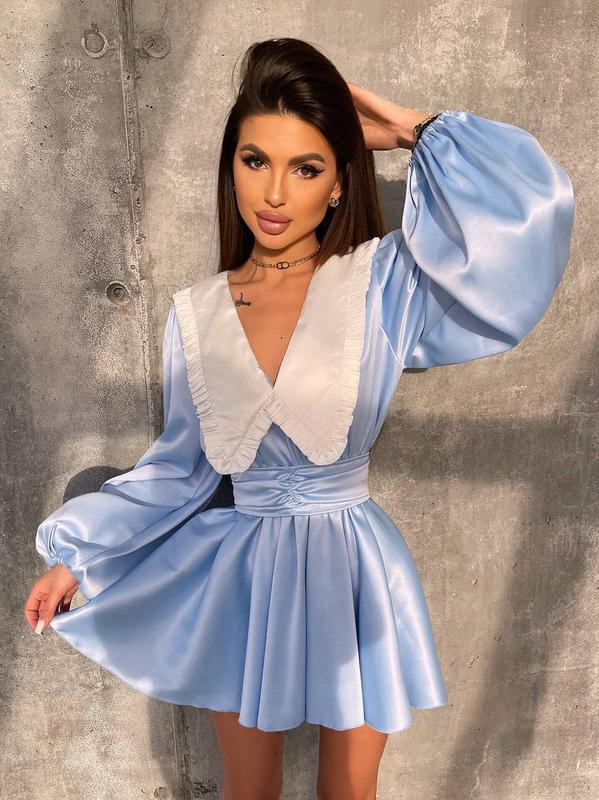 Женское голубое атласное короткое мини платье с белым воротничком и длинными рукавами baby...