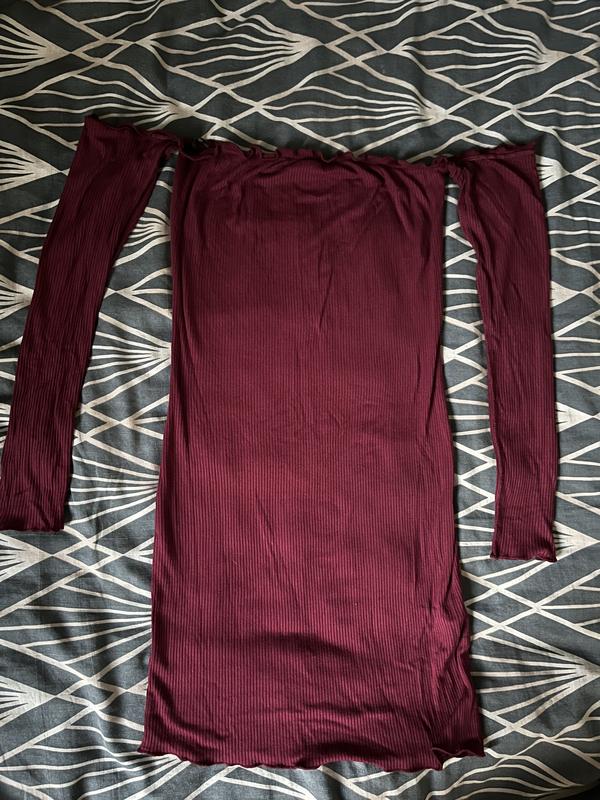 Рубчик,гарно тягнеться. Відкриті плечі,колір насичений бордовий