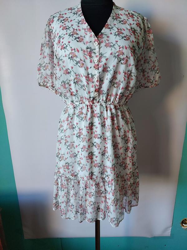 Святкова,легка на подкладка. Верх платья на пуговицах. Талия на резинке. Подойдет на размер 38-40.
