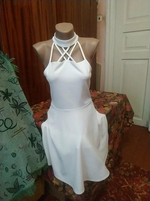 очень красивое белое платье с переплетом поверха.Ткань тянется,хорошо держит форму и шикарно смотрится.Рлзмер указан на рост 164, подойдет на с,м. опис состояние отлочный длина 79 ширина комди 40 ширина бедер 62