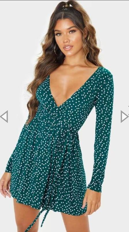 Модное трендовое платье в горошек, имеет завязки на талии, цвет очень красивое темнозеленое, ткань тянется легкая. В идеальном новом состоянии без бирки. На размер S.