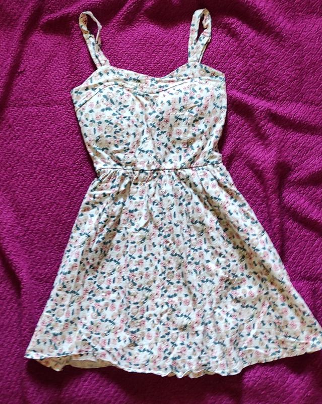 Сукня одягнена кілька разів. Тканина щільна з квітковим принтом. Дуже гарно виглядає на тілі. Чашечки вшиті, збоку таємний замочок.