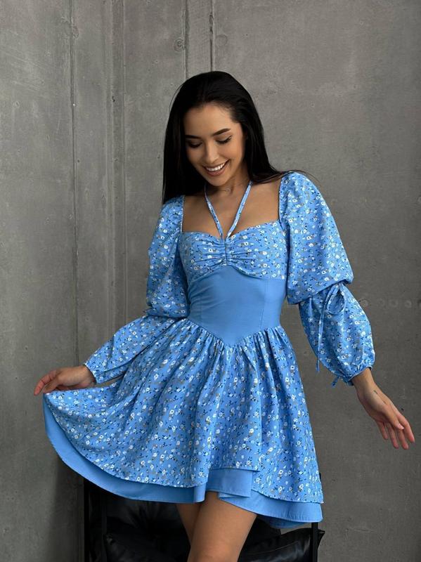 Платье Софи (Фотто приема) ▫️Мод: tr 0651 ▫️Ткань: Турецкий софт ▫️Цвета: черный, красный,голубой ▫️Размеры: 42/44 46/48 Очаровательное, цветочное платье софи с длинным регулируемым рукавом, корсетным поясом, лямочкой для декольте и пышной асимметричной двухслойной юбочкой мини🥵 Идеально с косухами, жакетами, как с грубыми ботинками так и с каблуками🔥 Создавай неповторимые образы с нами ❤️