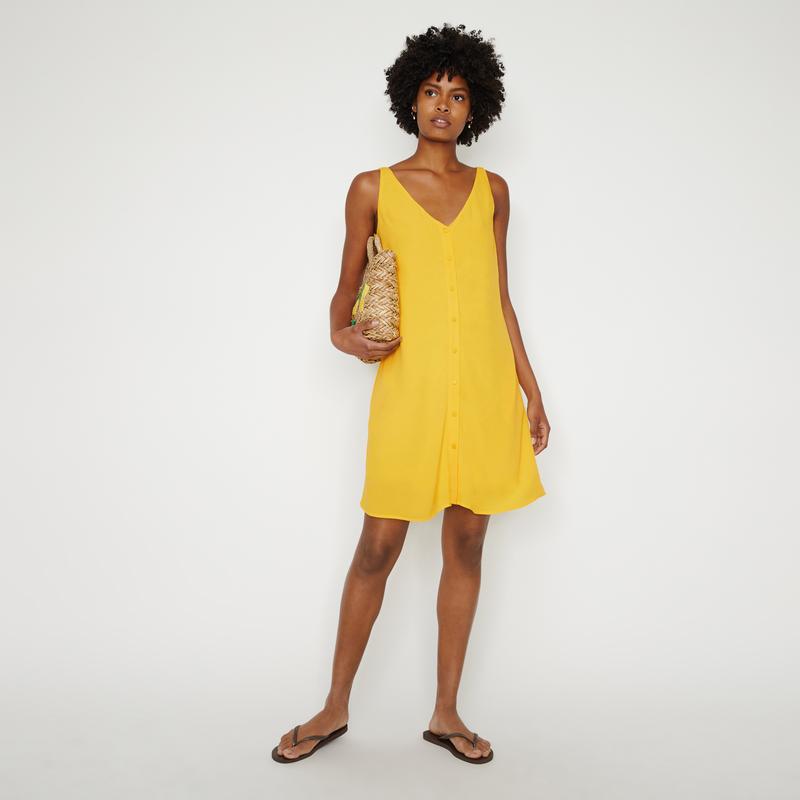 Короткое платье на пуговицах свободного кроя. По бокам карманы. Внутри есть подкладка, поэтому не просвечивает. Перед чуточку длиннее спинки. Рекомендую на рост 170-175. Есть нюансы - два следа от ручки спереди в районе груди-талии. Смотрите последние два фото. Замеры: полуобхват груди - 54 см полу охват талии - 58 см полуобхват бедер - 64 см длина - 85 см Состав: 100% вискоза