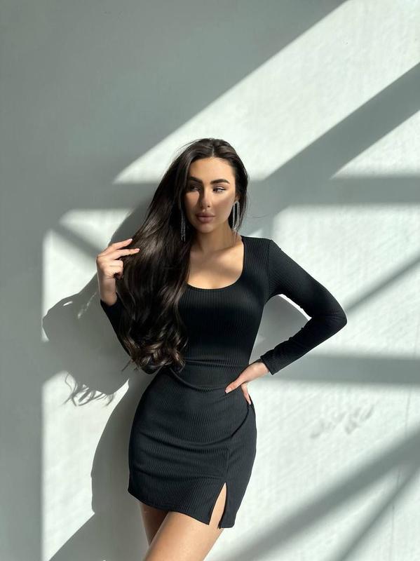 Любимое платье в мини длине Дизайнерское платье с корсетными завязками с разрезом на бедре В этом платье Вы точно будете в центре внимания Завятки идеально подчеркивают талию Тканина: рубчик мустанг Туреччина Размер: 42-46 (универсал) Цвет: черный ЗАМІРИ: Длина 85 см ОГ 89-100 см Ткань хорошо тянется
