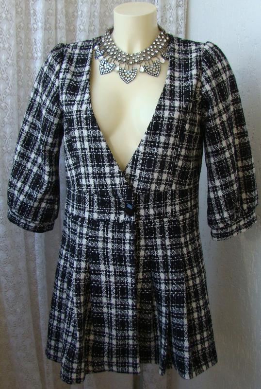 Важно!!! Пожалуйста, перед заказом прочитайте страничку "Обо мне", или напишите мне. Cloady Жакет платье в отличном состоянии, не носился, сток без этикетки. Недостатков не нахожу. Состав написан иероглифами, верхняя ткань мягкая толстенькая костюмная, почти букле, возможно, с шерстью, подкладка полиэстер Размер производителем написан М, но смотрите и по мерочкам Мерки: пог 50 см, пот 44,5 см, поб 69 см, длина 79 см, длина рукава 44,5 см, ширина плеч 34,5 см.