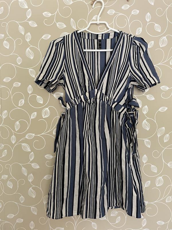 В идеальном состоянии, легкое, удобное, красивый вырез, бренд zara, по бокам бантики, резинка подчеркивает талию, есть карманы, а рисунок удлиняет визуально рост ) Длина 80 см, плечи 32 см, пояс 31 см, рукав 23 см