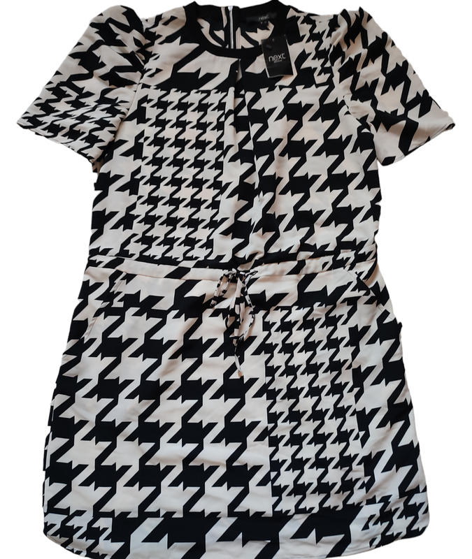 Платье Next черно-белого цвета. Талия регулируется поясом. Сзади металлическая молния. Два боковых кармана. Размер:" L" Длина: 88 см Пог: 54 см Пот: 47:см. Рукав: 29 см. Состояние новая вещь