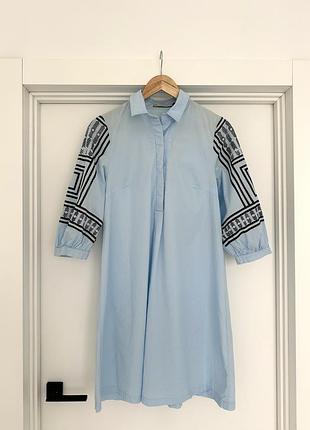 Платье в стиле вышиванки 💙 Узор нанесен краской. На одном из рукавов слегка стерта краска от глажения утюгом (8 фото) Материал: хлопок Длина: 91 см Рукав: 45 см На рукавах красивые бусины. Очень легкая, удобная, идеальна для жаркого лета.