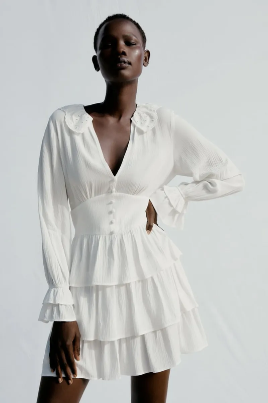 Переходите на страницу, продаю много красивых вещей 🤍 Платье с воротником с тонкой вышивкой. Имеет V-образный вырез с накладными пуговицами, длинные рукава с гофрированными эластичными манжетами, эластичную талию сзади и гофрированный край. Размер M, но лучше всего подойдет на S При необходимости отправь детальные обмеры
