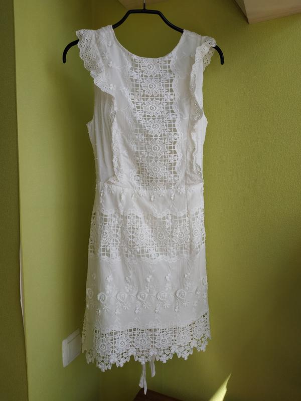 Белое платье из прошвы с открытой спиной. Платье из сетевая имеет подкладку. Открытая спина. Имеет молнию, завязки. Размер ХС - С Длина 80 см. Полуобхват в груди - 38 см. Полуобхват талии - 32 см Полуобхват бедер - 44 см