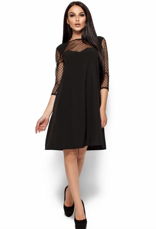 Платье-трапеция из легкой летней ткани, на груди, спинке и рукавах выполнено из сетки в горошек в тон, рукав 3/4 Материал: софт, сетка Размер: M (44-46)