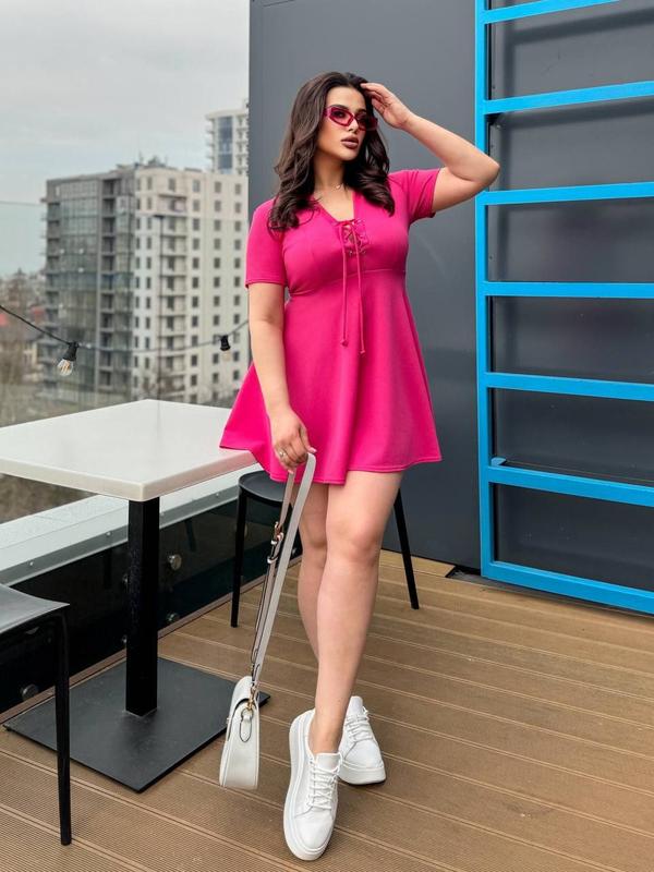 Весняна - літня прогулянкова сукня. Сукня, приталена по верху, низ - напівсонце,5-1 попереду розріз зі шнурівкою. Тканина мустанг рубчик, дрібна гладка структура. Тканина добре тягнеться. Склад: Поліестер - 95%, Бавовна - 5%. Колір: Чорний, Малина., Блакитний, Ліловий, Розміри 46-48, 50-52, 54-56, 58-60 Ціна 625 грн
