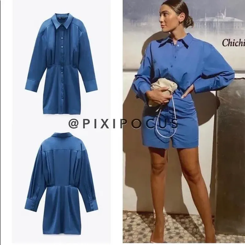 Платье-рубашка Zara приглушенного синего цвета (моя камера цвет не передала). Стан безупречен. Длина 80 см. Длина рукава 56 см. Подходит на размеры S-M
