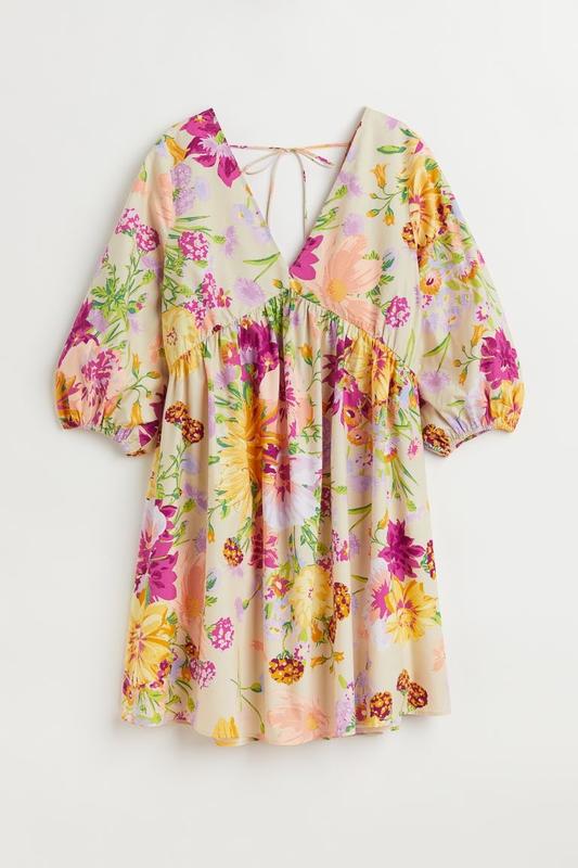 Розмір S (довжина 89 см,пог до 46 см,поб 66 см.) 100% бавовна. Коротка сукня із суміші бавовни та віскози. V-подібний виріз спереду та ззаду, горизонтальні зав’язки ззаду та широкі об’ємні рукави довжиною 3/4 з вузькою гумкою на манжетах. Зібраний шов під бюстом спереду, що продовжується до талії. Без підкладки.
