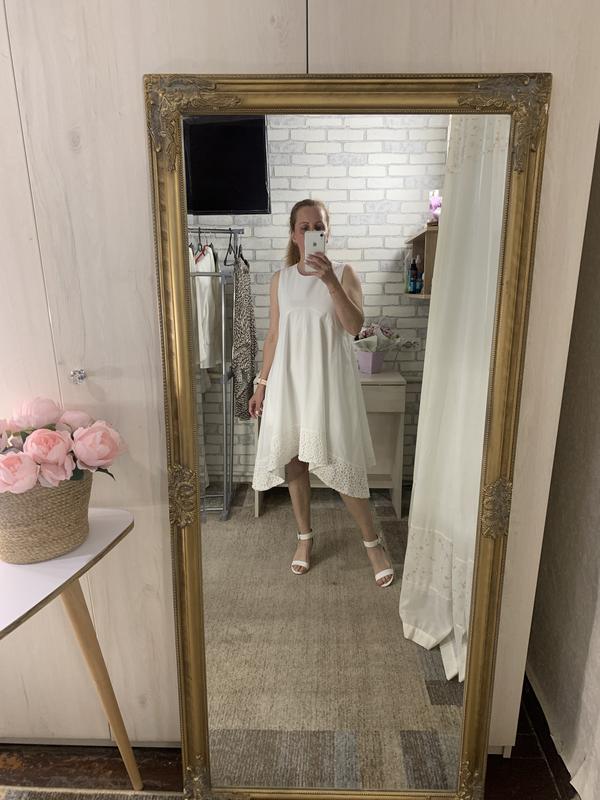 Красивое нежное романтичное платье в новом состоянии! Коттон и эластан, подкладка из полиэстера Размер S-M По груди 46, бедра свободно, длина спереди и сзади 89, длина по бокам 105 см