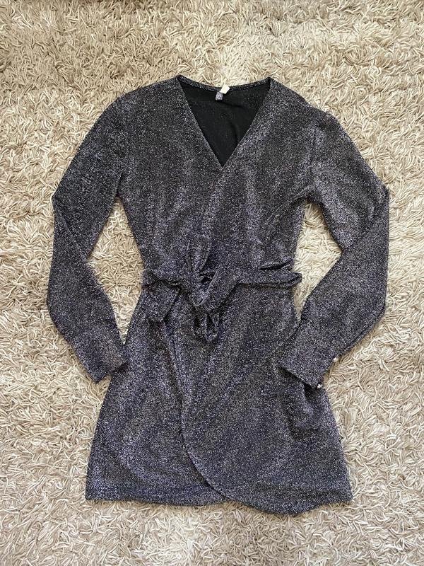 Блестящее серебряное платье на запах. Длина 80 см. Размер 44, подойдет на С. Поясок идет отдельно, ткань хорошо тянется. Состояние 4/5, есть несколько незаметных при ношении затяжек.