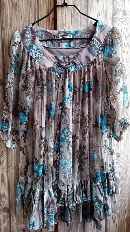 дуже гарне. зручне і приємне до тіла плаття з шифонової тканини сіре з голубими квіточками Підкладка зі стречевої тканини. тягнеться на ОБ - 102см розм.М-L довжина 85 см рукав три чверті плаття вільного крою з оборками буде також гарно і з паском