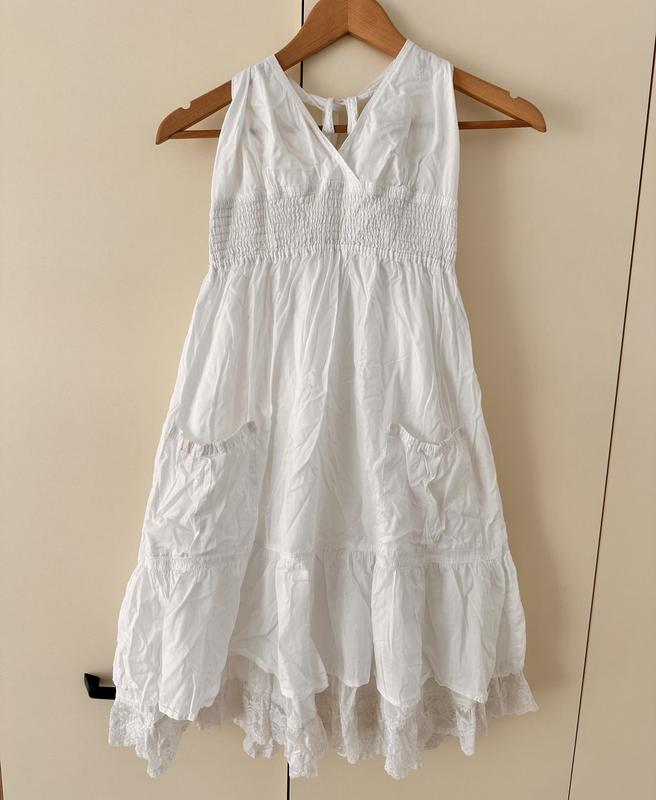 Плаття біле з мереживом на завʼязках з карманами. Збоку на застібці. Під груддями резинка. Розміри: - довжина від грудей - 90 см. - ширина - 33 см. За додатковими питаннями або фото в приватні повідомлення.