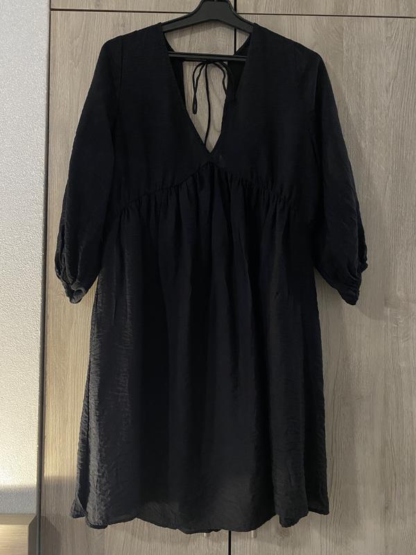 Черное летнее платье из сатина, материал просвечивается. Сзади на завязках