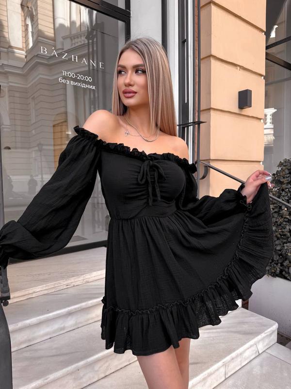 Сукня Дуже ніжна та романтична, з довгим рукавом ліхтарик на резинці, талія на резинці, спинка прострочена, по низу оборка Тканина: якісний натуральний "Муслін" Склад: 100% бавовна Колір: білий, чорний, рожевий, блакитній, барбі, жовтий Розміри: с-м; м-л Ціна 730 грн 📩 @*********
