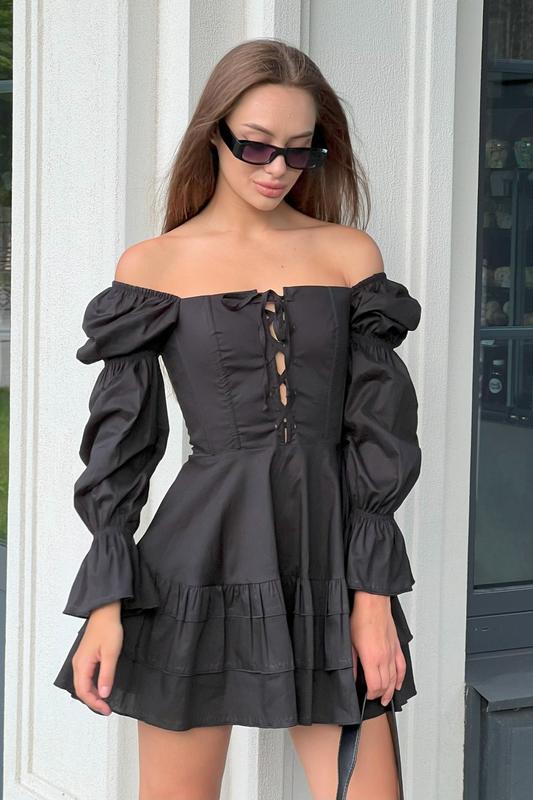 Черное короткое платье с корсетом мини платье с длинными объемными рукавами