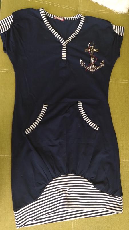 Великолепное летнее платье в морском стиле, с двумя функциональными кармашками по середине, из эластичного трикотажа. Новая, без нюансов. Замеры: длина 87 см, ПГ-39 см., ПТ 35 см., ПБ до 90 см., ткань хорошо тянется, оринтовно размер S-M.