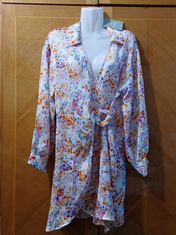 Совершенно новая вещь с бумажными брицами от известного шведского бренда H&M. Красивый цветочный рисунок. Ткань легкая, без подкладки, можно носить как тунику или удлиненную блузу. Идет на запах. Материал полиэстер, тонкий и легкий. На бирочке размер M. Замеры делали с середины. Полуобхват сзади груди 52 см, по талии 50 см, по низу 58 см. Ширина в плечах позаду 50 см. Рукав длина от плеча 52 см, включая манжеты 5,5 см. Высота по спине от плеча у горловины 88 см, от подмышек 58 см (из них до талии 11 см), по переду от плеча у горловины 88 см. Камера не совсем верна передает цвета, ближе всего 6 фото. Фото на теле взято из инета. ❗Отправляем после полной платы на карточку Приватбанка. ❗Доставка Новой или Укр по почте за средства покупателя. ❗Наложенного платежа, безопасной оплаты, возврата и обмена нет. ❗Карточку просить только в том случае, когда уверены, что покупаете товар. *10 155*