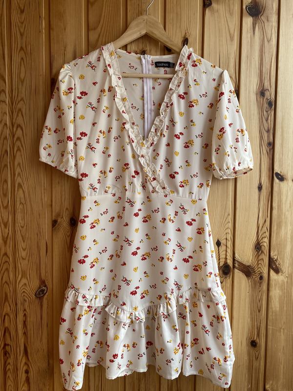 Короткое платье с цветочным принтом, от бренда boohoo Красиво садится по фигуре, подойдет на размер S/M Длина - 87 см Полуобхват груди - 47 см Полуобхват талии - 36 см Полуобхват бедер - 47 см