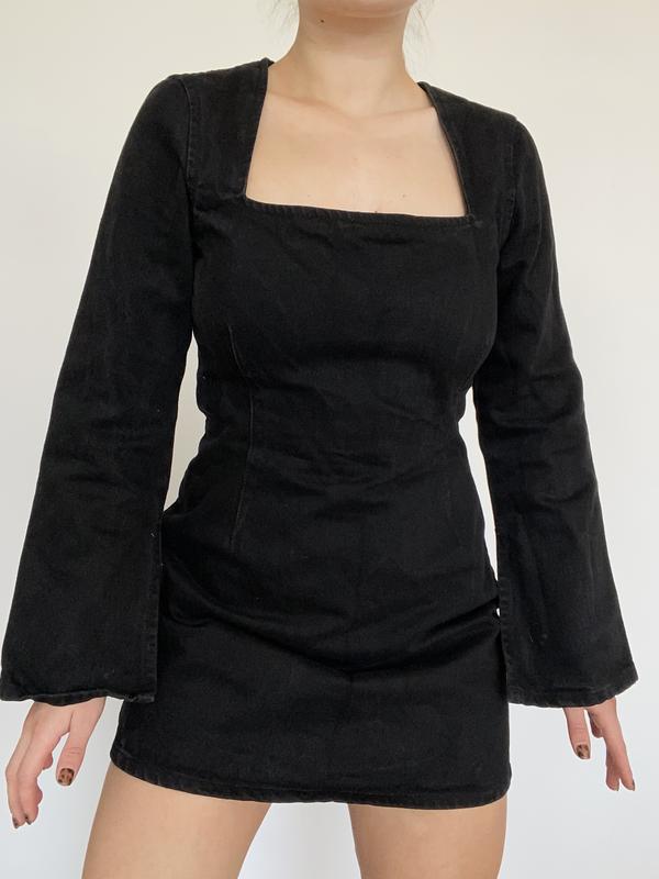 джинсовое платье с клеш рукавами, на рукавах разрезы, плотная, держит форму, 100% коттон, размер м, на фото одето на с