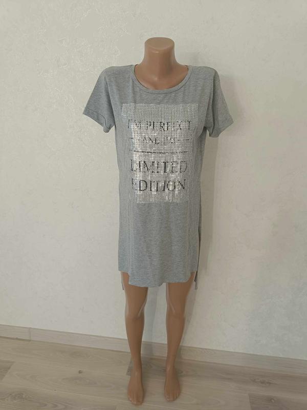 Платье туника с разрезами по бокам. На размер M- L. Длина- перед- 77 см, зад- 94 см, ПОГ- 50 см. Рукав- 15 см. ПОБ- 50 см. Состав- 90% вискоза, 10%- еластан.