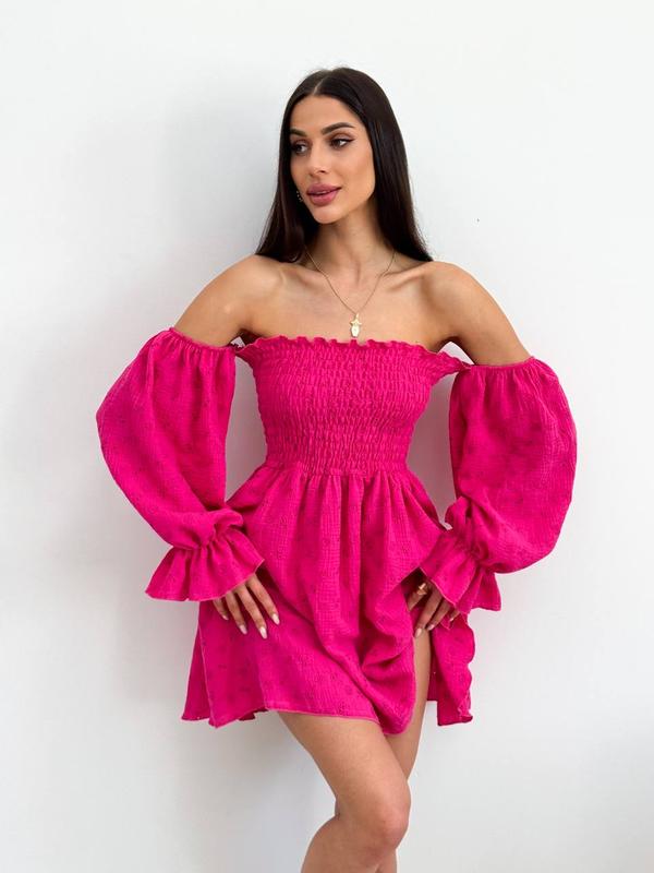 Новинка, которая уже в наличии🕊 Хлопковое платье с прошвой 🤍 Модель 5030 ▫Ткань: муслин с прошвой, хлопок 100% ▫Размерный ряд: 42-46, 48-52 ▫Цвета: малина,черный, белый, беж, пудра 🏷 1200 грн Наши фото Реал Муслиновое легкое платье с прошвой, утягивающей резинкой, которое визуально уменьшает талию<unk> Очень красиво подчеркивает формы и ложится по фигуре🌸