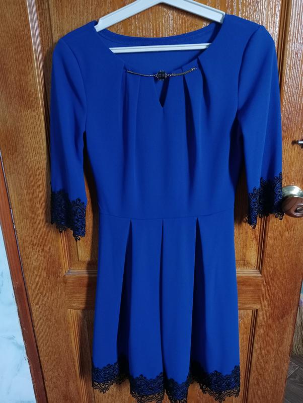 Платье женское синего цвета с черным кружевом на рукавах и снизу. Размер S-M. Наделась один раз. По замерам и дополнительным фото пишите)