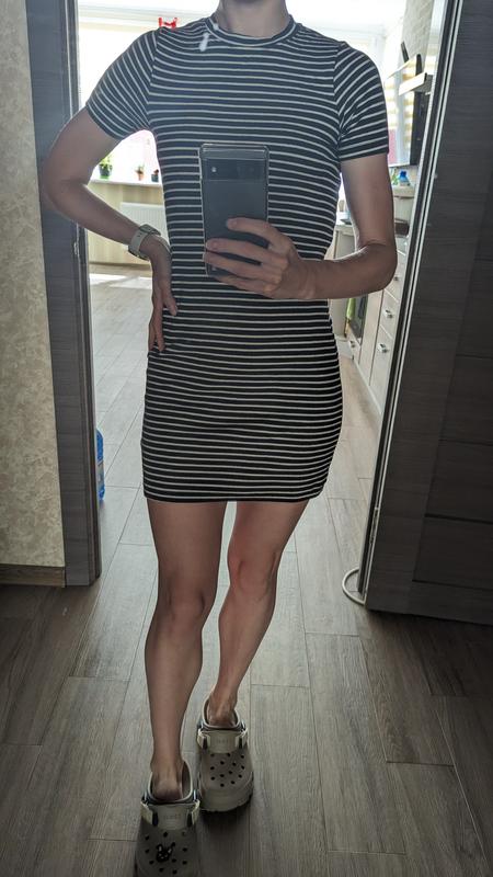 Платье в полоску облегающего фасона, очень комфортное на теле, ткань в рубчик. По бирке xs, сейчас бедра 93 и платье все еще сидит красиво но достаточно короткая (рост 162). Когда бедра были 90 платье меньше растягивались на бедрах и была более комфортной длины, поэтому учитывайте этот момент :)
