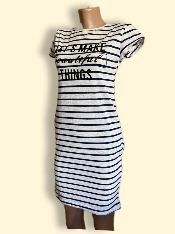 Прекрасное летнее платье, производство Турция. Лаконичный крой. Выдержаны простота в линиях и деталях. Платье в горизонтальные черно-белые полосы. Спереди принт в виде надписи черного цвета. Рукав короткий. Есть два кармана внутренних по бокам. Платье не давит, все швы выполнены аккуратно. Легкость ткани и длина изделия позволяют чувствовать себя комфортно в жаркую погоду. Основные параметры Размер XS ПОГ-40 см ПОТ-37см ПОБ-44см. Длина издели-82см Ширина спины-34см Длина рукава-9см Обхват рукава-28см. 👚Вещи все новые это не сток, товар на распродаже после закрытия магазина. Смотрите мои другие объявления. Подписывайтесь. Приятных покупок.🎁