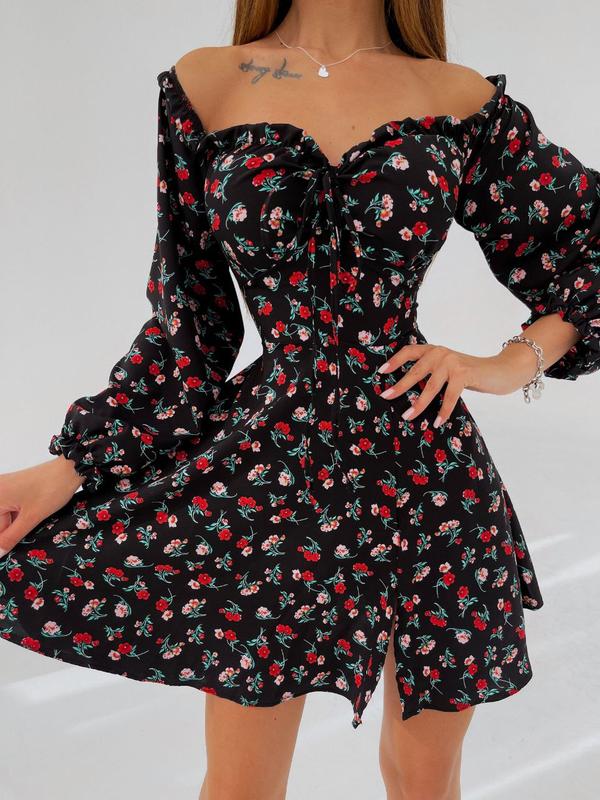 Цветочное платье Размеры: 42-44, 44-46 Цвет: белый, черный Романтичное платье из легкой летней ткани- софт. По фасону - спущенные рукава, лиф на завязке, объем регулируется на спинке. Юбка полусолнце, разрез на одну ножку.